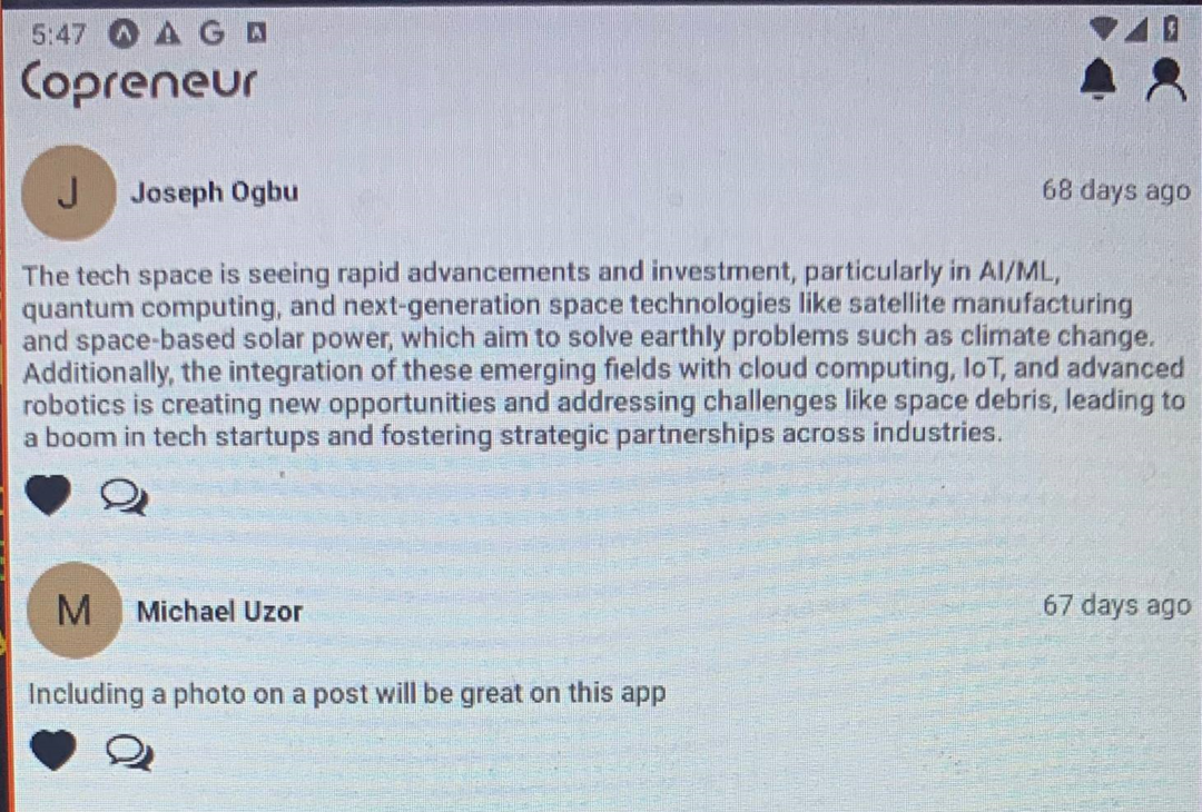 Coprenur is a networking app developed in October 2025 to solve a pervasive problem within the Nigerian tech community. This app helps to bridge the gap between developers and entrepreneurs, allowing a free workflow between the two parties.